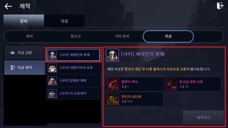 ㆍ 이야기 완료 시 [제작 → 의상 제작] 메뉴에서 신규 의상을 제작할 수 있습니다.