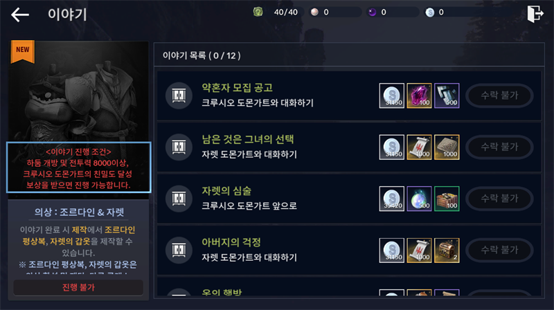 [의상 이야기 : 조르다인 자렛] 진행이 안되실 때 진행 방법 (크루시오 도몬가트의 친밀도)
