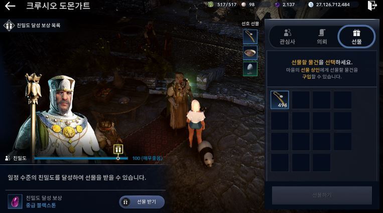 ㆍ 하둠 개방, 전투력 8,000 이상, 크루시오 도몬가트의 친밀도 달성 보상 수령 시 이야기를 진행할 수 있습니다.