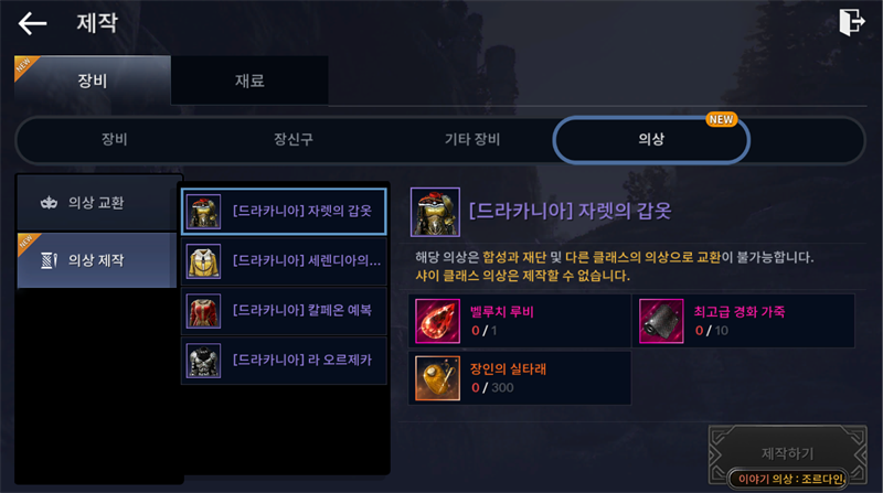 - 이야기 완료 후 [제작 > 의상 제작] 메뉴에서 신규 의상을 제작할 수 있습니다.