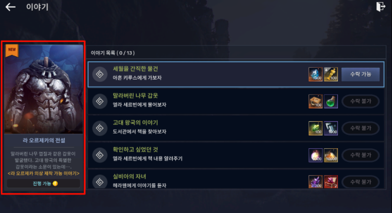 ㆍ 신규 이야기 '라 오르제카의 전설'은 메디아 북부 주요 의뢰, 제10장 '어둠을 밝히는 빛' 완료 시 진행할 수 있습니다.